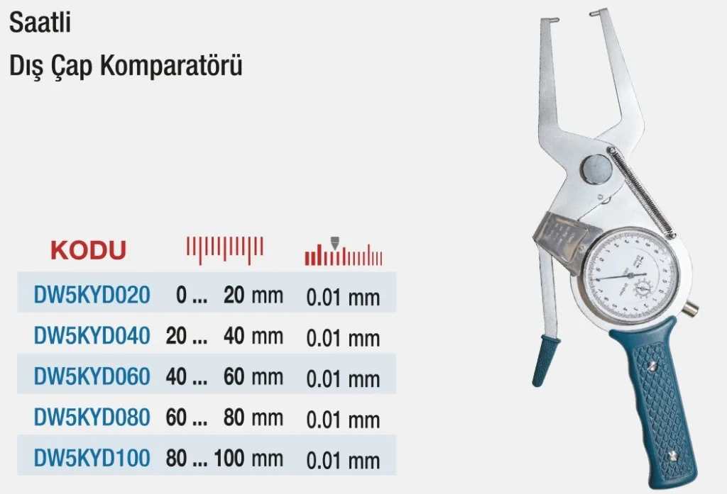 D&W Saatli Dış Çap Komparatörleri, dış yüzeylerde hassas ölçüm yapmak için özel olarak tasarlanmıştır. Gelişmiş yay sistemi ve yüksek hassasiyetli saat mekanizması sayesinde mikron seviyesinde doğruluk sunar. Sağlam kadranı ve dayanıklı gövdesi, yoğun sanayi ortamlarında uzun ömürlü kullanım sağlar. CNC üretim, torna, kalıpçılık ve kalite kontrol gibi alanlarda sıkça tercih edilir. Özellikle dairesel dış yüzeylerin ovalite ve çap kontrolü için ideal bir çözümdür.