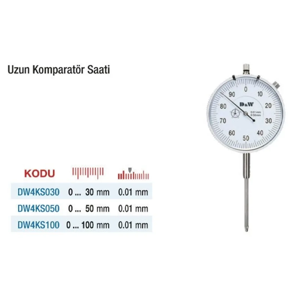 D&W Uzun Komparatör Saati, standart komparatörlere göre daha uzun boyutlara sahip olması sayesinde derin noktalarda ölçüm yapmayı mümkün kılar. CNC işleme, boru içi ölçümler ve kanal kontrolü gibi uygulamalarda yüksek doğrulukla çalışır. Milimetrik ölçü kadranı ve hassas yay mekanizması ile mikron düzeyinde hassasiyet sunar. Endüstriyel sahalarda, kalıp üretiminde ve torna işlemlerinde güvenle tercih edilir. Sağlam yapısı sayesinde yoğun kullanım şartlarına karşı dayanıklıdır.
