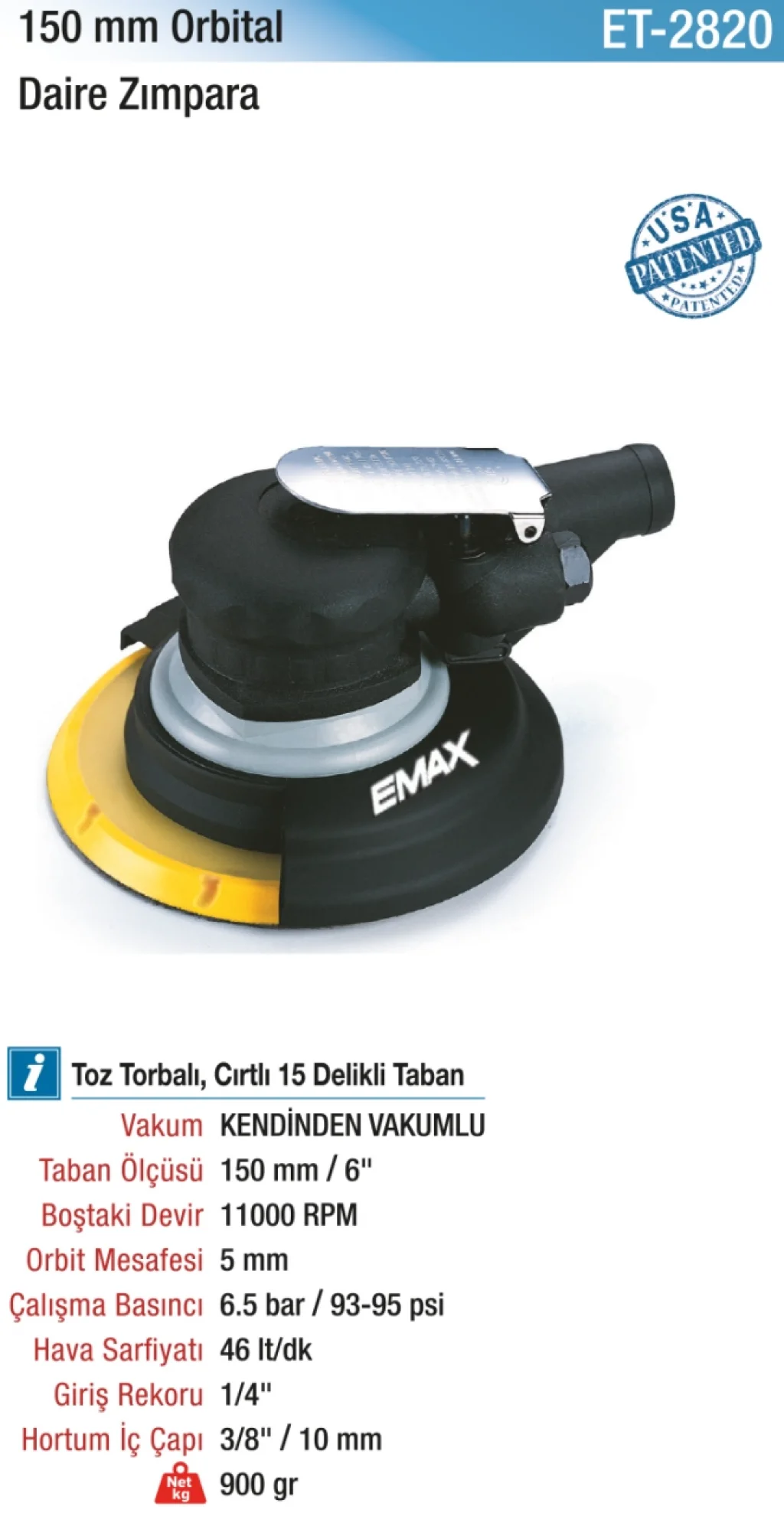 | Çalışma Basıncı | 6.5 bar / 93...95 psi | ||