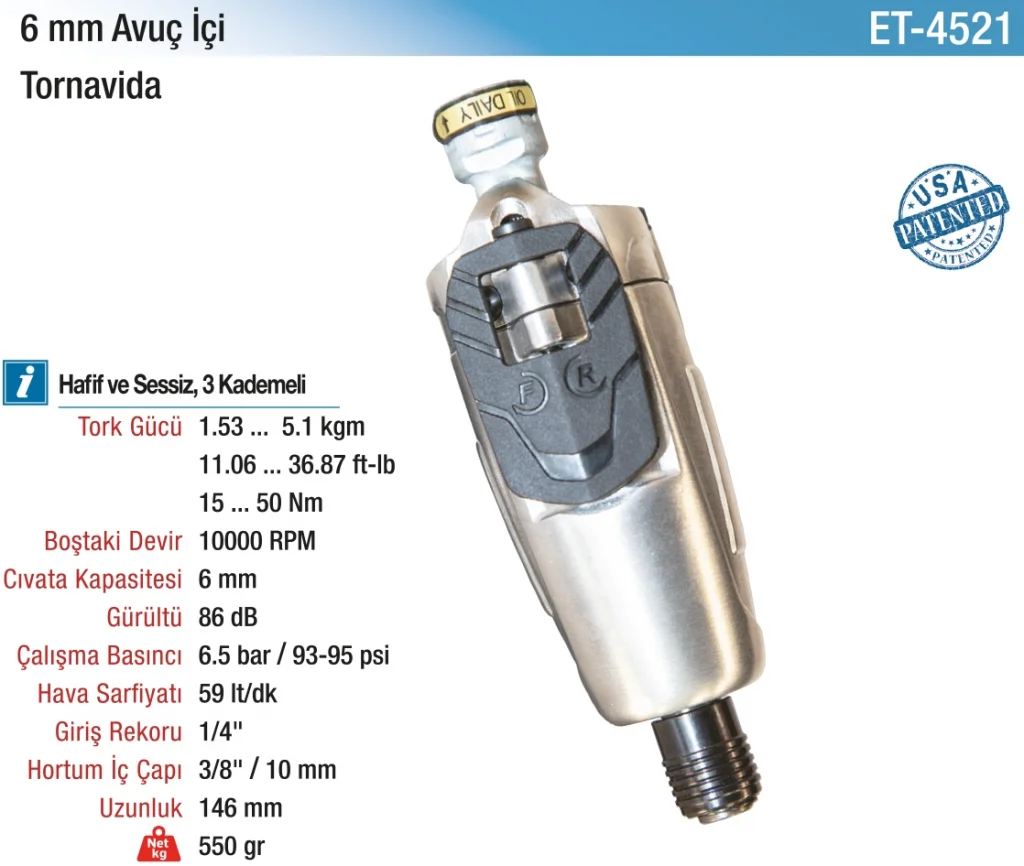 | Tork Gücü | 1.53 ... 5.1 kgm / 11.06 ... 36.87 ft-lb / 15 ... 50 Nm | ||