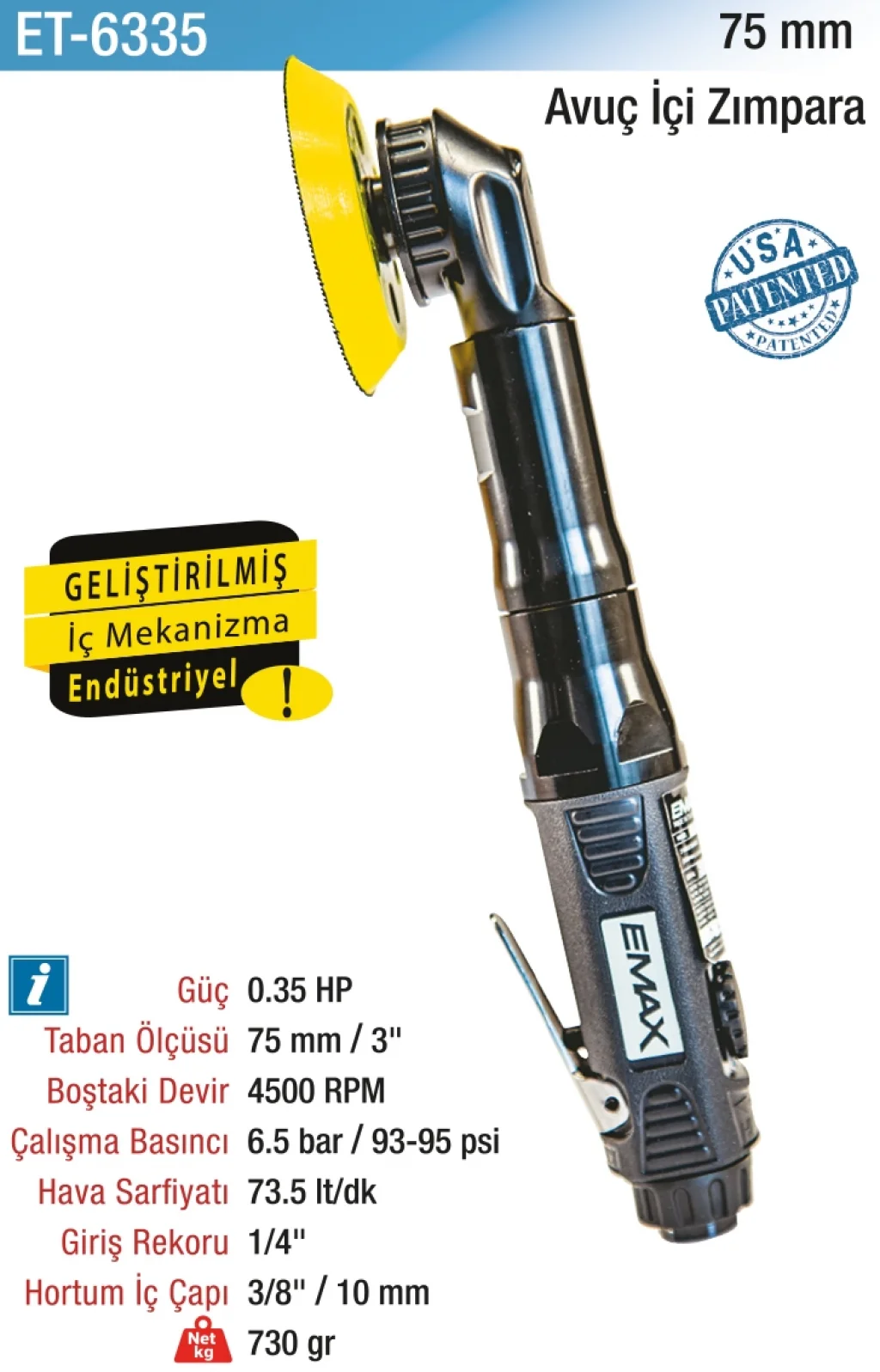 75 mm 4500 RPM 0.35 HP Havalı Avuç İçi Zımpara, hızlı ve hassas zımparalama işlemleri yapmak için tasarlanmış, yüksek performanslı bir havalı zımpara aracıdır. 4500 RPM hız ve 0.35 HP motor gücü sayesinde, metal, ahşap, plastik gibi çeşitli yüzeylerde hızlı ve düzgün zımparalama sonuçları sağlar. Kompakt avuç içi tasarımı ve ergonomik yapısı, konforlu kullanım sunar ve dar alanlarda bile kolayca işlem yapabilmenize olanak tanır.