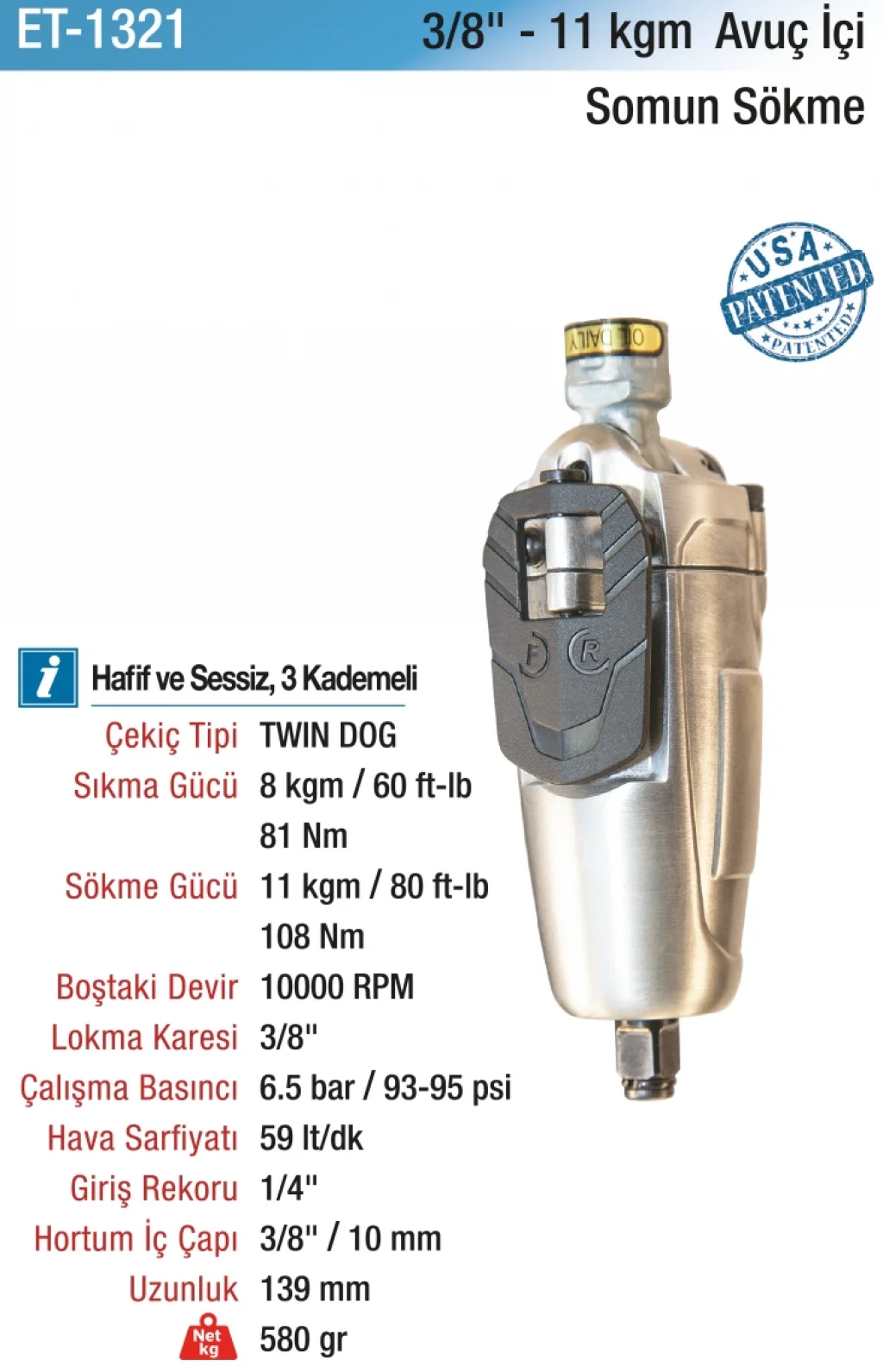| Sıkma Gücü | 8 kgm / 60 ft-lb / 81 Nm | |