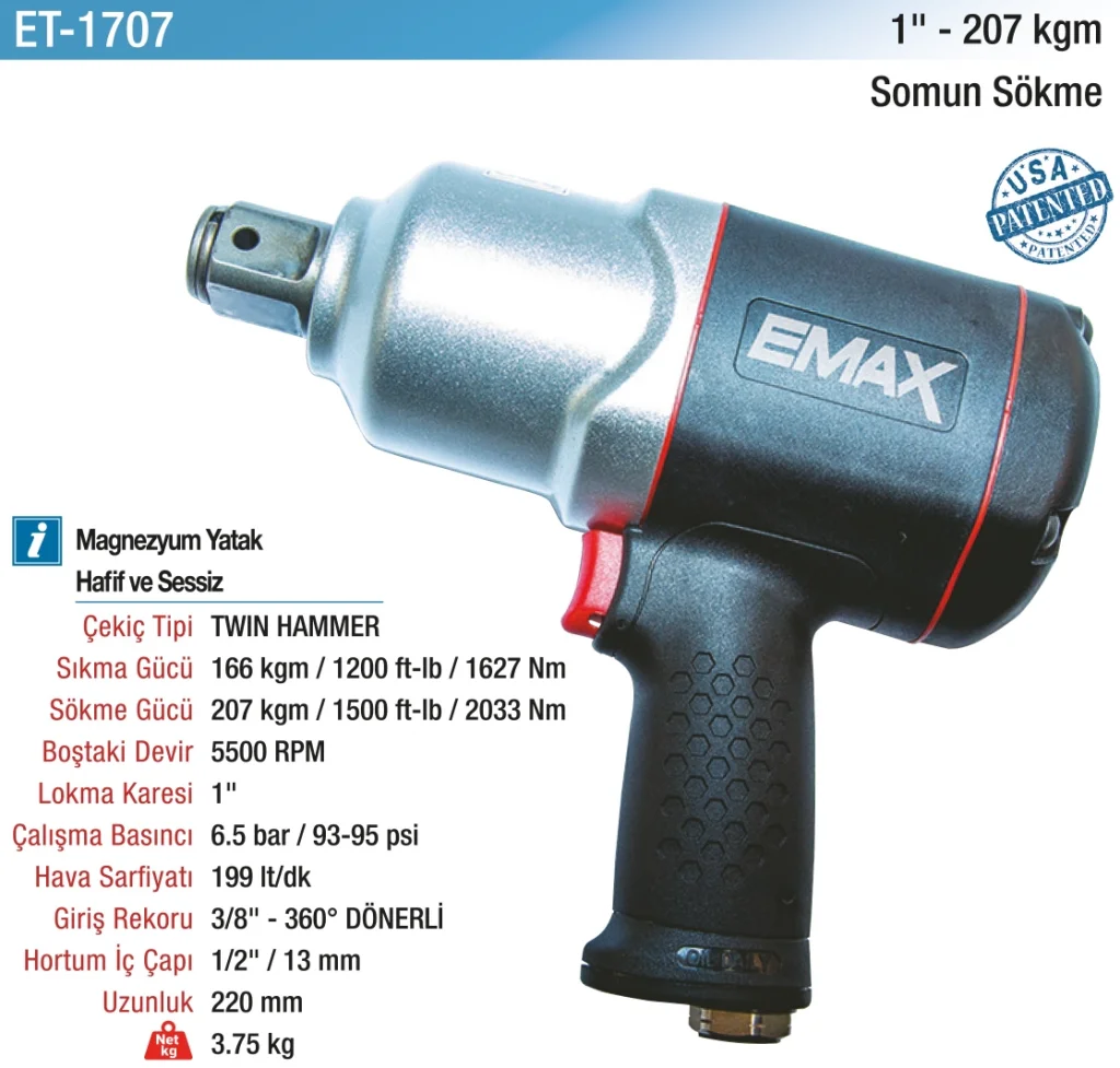 | Sıkma Gücü | 166 kgm / 1200 ft-lb / 1627 Nm | |