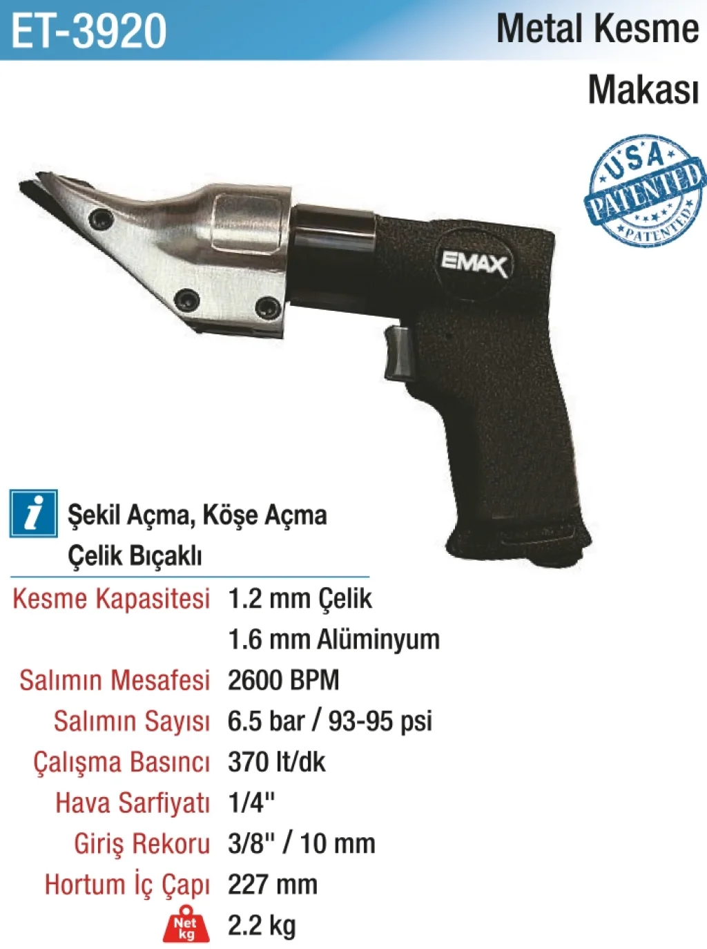 Havalı Metal Kırpma Makası, hepsicinde kullanım için tasarlanmış profesyonel bir metal kesme aracıdır. Dayanıklı yapısı ve keskin bıçakları sayesinde işlerinizi hızlı ve kolay bir şekilde yapmanıza olanak tanır.