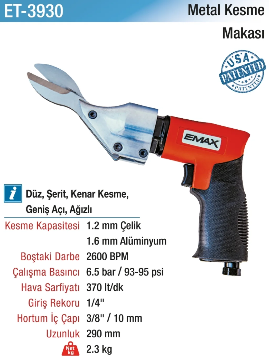 Emax Havalı Metal Kesme Makası, yüksek performans, dayanıklılık ve hızlı kesim gibi özellikleri ile her türlü metal kesme işinizde size yardımcı olacaktır. Zaman kazandıran verimli kesimler ve düzgün kesim kenarları ile işlerinizi kolaylaştırır.
