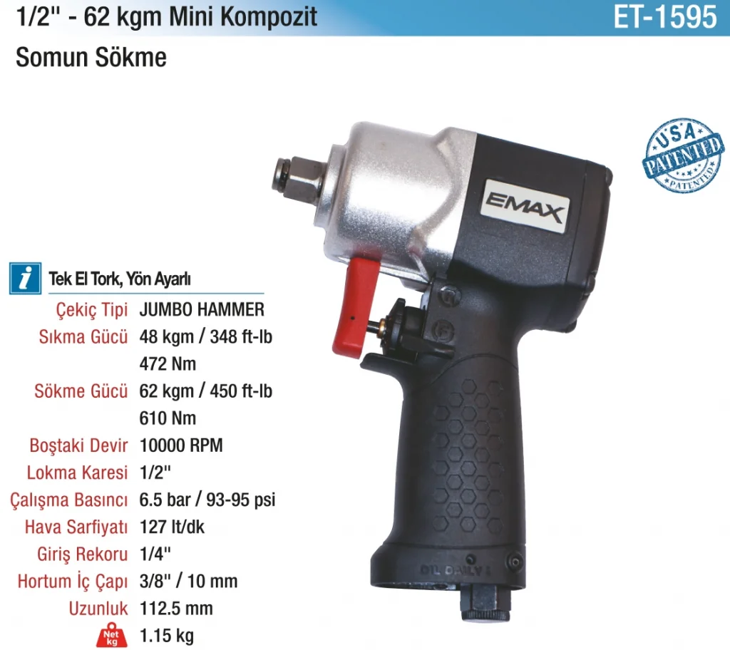 | Sıkma Gücü | 48 kgm / 348 ft-lb / 472 Nm | |