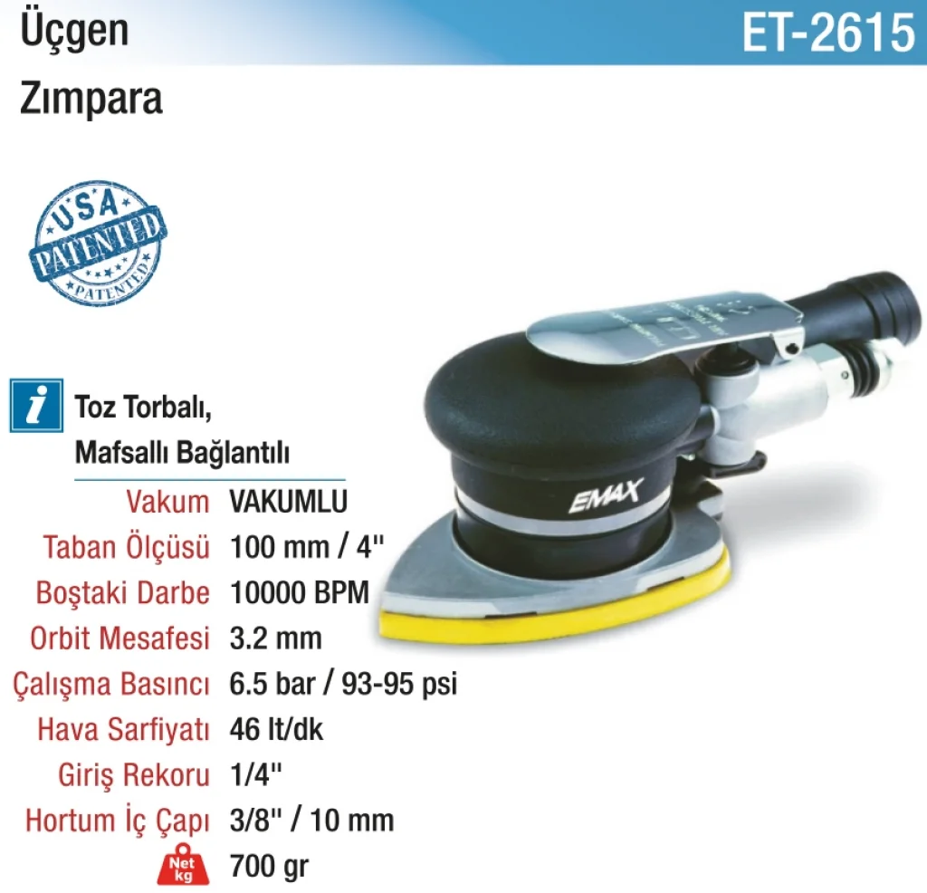 100 mm. 10000 BPM Havalı Üçgen Zımpara, hızlı zımparalama, yüksek hassasiyet ve kolay kullanım ile her türlü yüzeyde mükemmel sonuçlar sağlar. Köşe ve kenarlarda etkili çalışma özelliği ile verimli ve düzgün yüzeyler elde etmenizi sağlar.