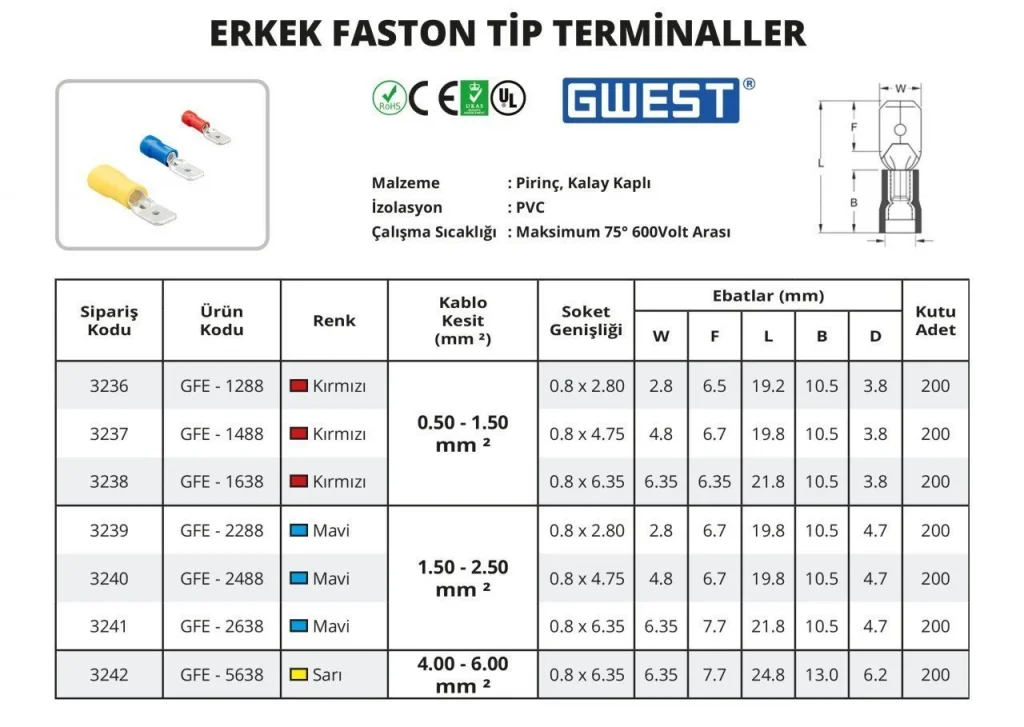 Erkek Faston Tip Terminal, hızlı ve güvenli bağlantılar sağlar.