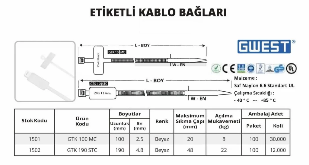 Etiketli Kablo Bağları 100 Adet, kablo düzenleme ve organizasyon işlemlerini kolaylaştıran pratik bir üründür. Bu etiketli bağlar, kabloları sıkıca tutarak düzenli bir şekilde saklanmasına yardımcı olur. Her bir kablo bağının üzerinde etiket alanı bulunması, her kabloyu kolayca etiketleyip tanımlamanızı sağlar, böylece karmaşayı önler. Elektrik işleri, ofis kullanımı veya evdeki elektronik aletlerin kablolarını düzenlemek için idealdir. Dayanıklı malzemeden üretilmiş olan bu kablo bağları, uzun süreli kullanım sağlar ve kolayca uygulanabilir.
