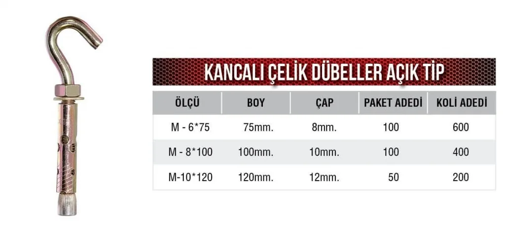 Yüksek Dayanıklılık:Frt Kancalı Dübel 6*75 Açık Tip, yüksek kaliteli metal malzemelerden üretilmiştir. Bu, dübelin dış etkenlere karşı dirençli olmasını sağlar ve uzun süreli kullanım imkanı sunar.