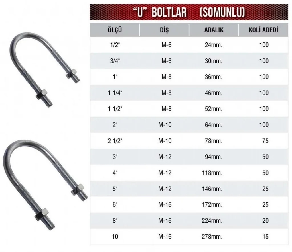 Dayanıklı ve Güvenilir: Bu U bolt, ağır yük taşıma ve zorlu koşullarda mükemmel dayanıklılık gösterir. Sağlam malzeme yapısı, uzun yıllar boyunca güvenle kullanılmasını sağlar.