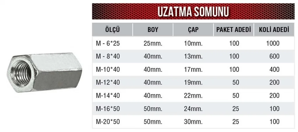 Yüksek Dayanıklılık:Frt Uzatma Somunu M-10*40, zorlu koşullarda bile dayanıklılığını korur, uzun süreli kullanım sağlar.
