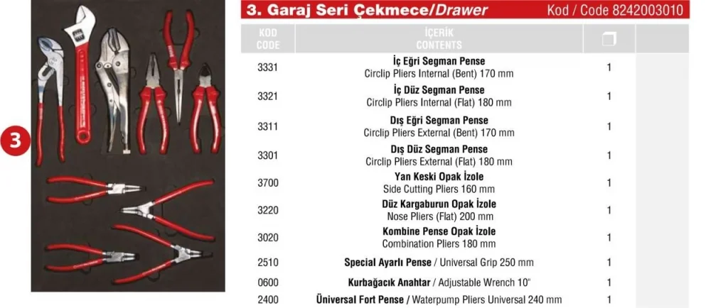 Eğer kompakt, ergonomik ve dayanıklı bir çekmece içi el aletleri seti arıyorsanız, Garaj Dolap 3. Çekmece İçi 10 Parça tam size göre! Şimdi sipariş verin ve profesyonel çalışma alanınızı düzenleyin!