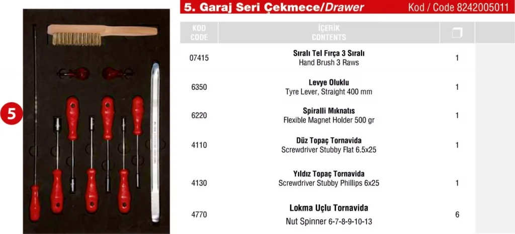 Eğer kompakt, ergonomik ve dayanıklı bir çekmece içi el aletleri seti arıyorsanız, Garaj Dolap 5. Çekmece İçi 11 Parça tam size göre! Şimdi sipariş verin ve profesyonel çalışma alanınızı düzenleyin!
