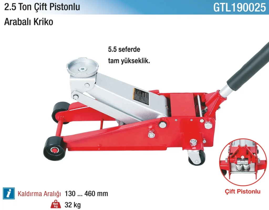 Hepsicinde 2.5 ton Çift Pistonlu Arabalı Kriko, günlük kullanım için mükemmel bir seçenektir. Dayanıklı yapısı ve yüksek performansı ile aracınızı kolayca kaldırabilir ve bakım işlemlerinizi hızlı bir şekilde gerçekleştirebilirsiniz. Kaliteli malzemelerden üretilmiş olan bu kriko, uzun ömürlü kullanım sağlar.