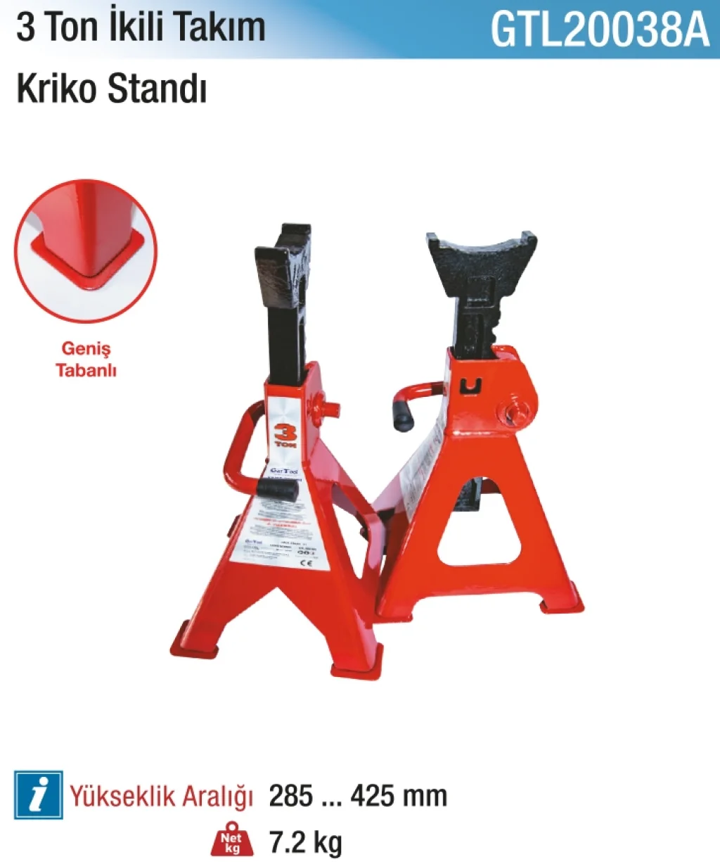 3 Ton 285-425 mm Kriko Standı (İkili Takım), araç tamir ve bakım işlemlerinde güvenli ve sağlam destek sağlar. 3 ton taşıma kapasitesiyle çeşitli araç türlerine uygundur. 285 ila 425 mm arasında ayarlanabilen yükseklik aralığı ile farklı araç yüksekliklerine kolayca uyum sağlar. İkili set olarak sunulan bu kriko standları, dayanıklı çelik malzemeden üretilmiş olup uzun ömürlü ve güvenilirdir. Atölye ve profesyonel kullanım için ideal çözüm.