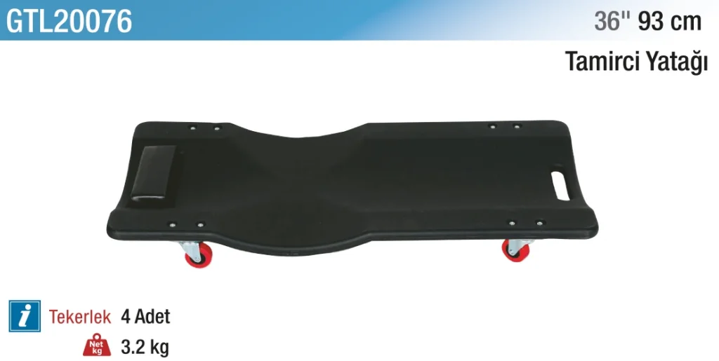 36" (93 cm) Tamirci Yatağı, araç altı ve dar alanlarda rahat çalışmayı sağlayan dayanıklı bir tamirci matıdır. Hafif yapısı sayesinde kolayca taşınabilir ve kullanılabilir. 93 cm genişliği, çalışma konforunu artırır ve ergonomik destek sağlar. Dayanıklı malzemesi ile uzun ömürlü kullanım sunar. Tamir işlerinde konfor ve pratiklik arayanlar için ideal bir üründür.