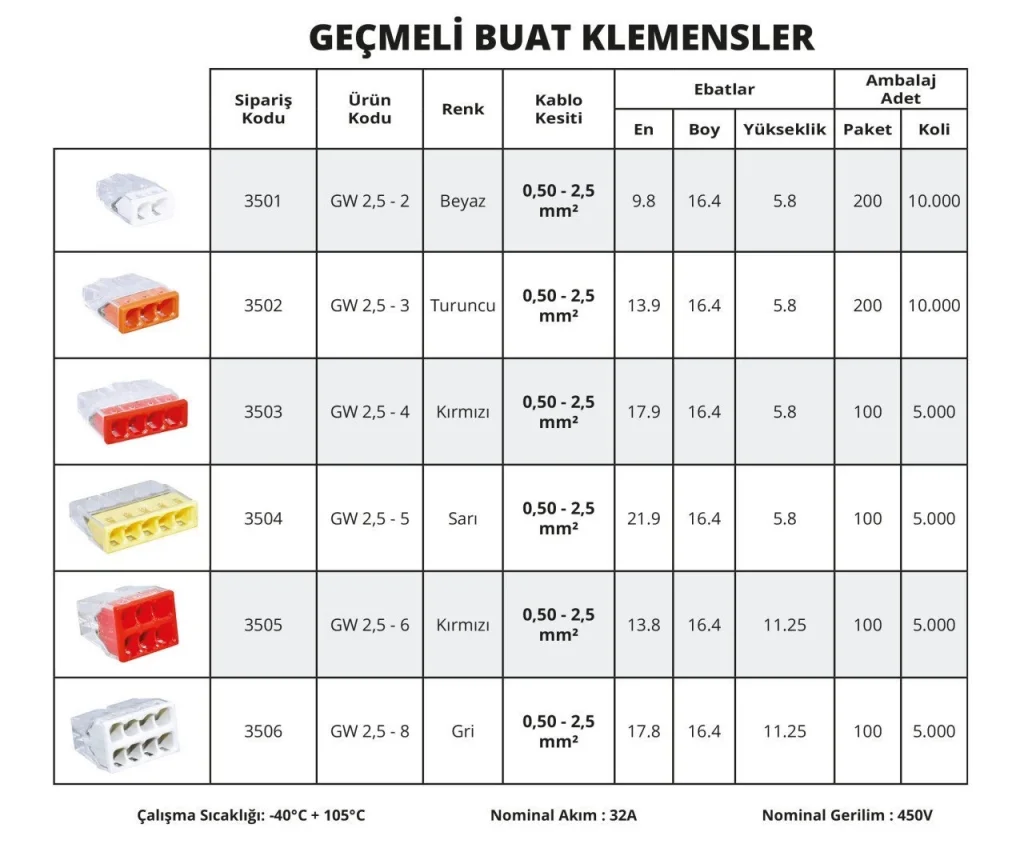 GW 2,5 - X Geçmeli Buat Klemens, elektrik kablolarını bağlantı noktalarında güvenle birleştirmek için tasarlanmıştır. 2,5 mm² kesitindeki kablolarla uyumlu olup, geçmeli yapısı sayesinde kolay ve hızlı montaj sunar. Y adet paket içeriği ile uzun süreli kullanım ve yedekleme avantajı sağlar. Isı ve elektrik yalıtımı yüksek kaliteli malzemeden üretilmiştir. Panolar, kutular ve cihaz bağlantılarında tercih edilir. Bu klemensler elektriksel güvenliği ve bağlantı dayanıklılığını arttırır.