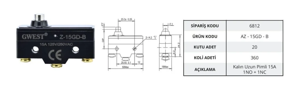 Gwest AZ‑15GD‑B Kalın Uzun Pimli 15A Mikro Switch, ağır hizmet tipi uygulamalar için optimize edilmiştir. Kalın pim yapısı, yüksek mekanik dayanım sağlar ve zorlu çalışma koşullarında bile formunu korur. 15 amperde sorunsuz çalışır. 20 adetlik set, birden fazla cihaz veya panoda kullanılmak üzere ideal stok çözümüdür.