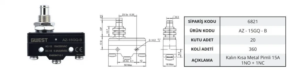 Gwest AZ‑15GQ‑B, kalın kısa pim tasarımıyla düşük profilli yüzeylerde kullanım için ideal bir mikro switch modelidir. 15 A dayanımı, otomatik sistemlerde güvenilir anahtarlama sağlar. 20 adetlik set, bakım stokları ve seri montajlar için uygundur.