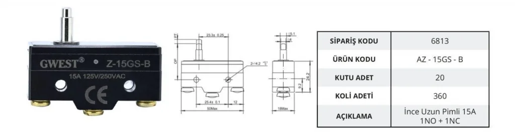 Gwest AZ‑15GS‑B İnce Uzun Pimli 15A Mikro Switch, yüksek hassasiyetli uygulamalar için tasarlanmış endüstriyel standartlarda bir anahtardır. İnce ve uzun pim tasarımı sayesinde erişimi zor alanlarda bile kolay montaj imkânı sunar. 15 amper taşıma kapasitesi, yüksek dayanıklılık ve güven sağlarken, 20 adetlik set olarak sunulması büyük pano ve seri üretim projeleri için idealdir.