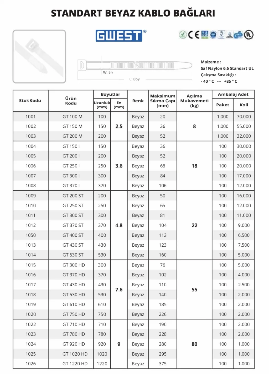Gwest Beyaz Kablo Bağları, her türlü kablo yönetim işlemi için güvenli ve sağlam bir çözüm sunar. Yüksek kaliteli malzeme, bağın kolayca kırılmasını veya forme edilmesini engeller, bu da kullanıcıya uzun süreli kullanım imkanı sağlar. Ayrıca, kolayca gerilebilir ve sıkıştırılabilir, bu da uygulamayı son derece pratik hale getirir.