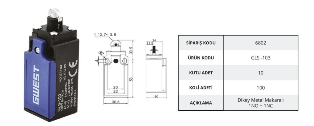 Gwest GLS-103, temel limit kontrol uygulamaları için geliştirilmiş dikey metal makaralı bir anahtardır. Dikey eksende çalışan kol mekanizması, yukarıdan gelen hareketleri etkili şekilde algılar.
