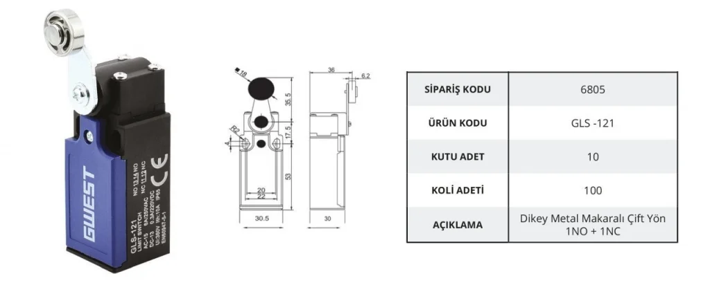 Gwest GLS-121, dikey yerleştirilen metal makaralı kol yapısıyla hem yukarıdan hem aşağıdan gelen hareketleri algılayabilen çift yönlü bir limit switch modelidir. Bu tasarım, sistem içerisinde sınırlı alanlarda dahi yüksek hassasiyet sunar.