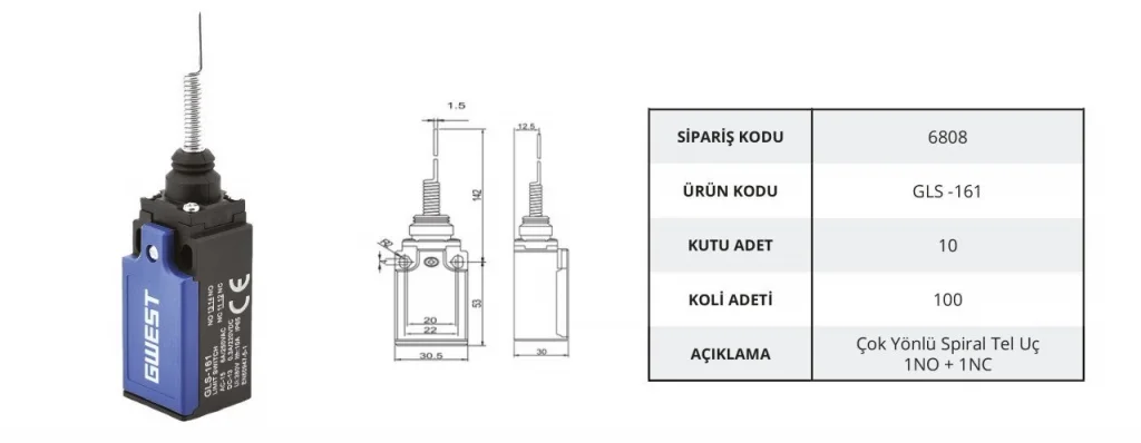 Gwest GLS-161 limit switch, çok yönlü algılama kabiliyetine sahip spiral metal uç tasarımıyla dikkat çeker. Spiral tel yapı, yüksek esneklik ve aynı zamanda dayanıklılık sunarak darbe anında kırılmadan bükülebilir. Bu sayede robotik sistemlerde, hızlı konveyör hatlarında ve pozisyonlama sistemlerinde ideal performans gösterir. Tüm yönlerden gelen temaslara hassasiyetle tepki verir. Dayanıklı dış gövdesi, uzun süreli kullanımda dahi performans kaybı yaşamaz. 10’lu paket, büyük sistem kurulumlarında maliyet avantajı sağlar.