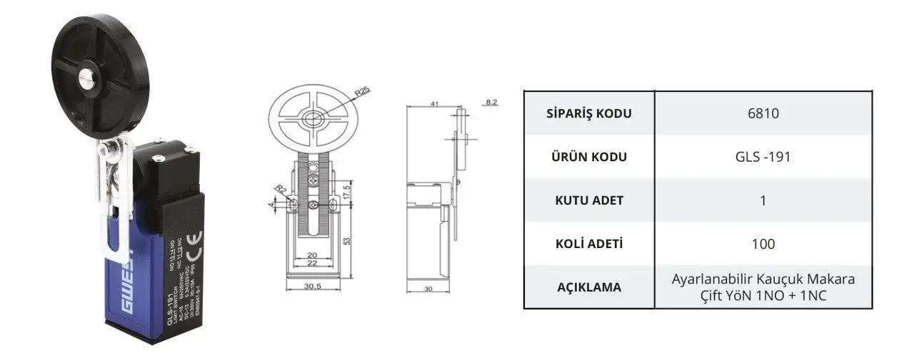 Gwest GLS-191 limit switch, ayarlanabilir yapıda tasarlanmış kauçuk makaralı bir limit anahtarıdır. Sessiz, yumuşak ve hassas tetikleme sağlayan kauçuk makarası sayesinde kırılgan ya da hassas yüzeylerle temasta mükemmel uyum sağlar. Genellikle montaj hatlarında, robotik sistemlerde, otomatik kapı mekanizmalarında ve CNC makinelerinde kullanılır. Ayarlanabilir kol pozisyonu, farklı uygulamalara kolay entegrasyon sunar. Sağlam dış gövdesi ve Gwest kalitesiyle, zorlu sanayi ortamlarında bile sorunsuz çalışır. 10’lu seti ile sistem kurulumları ve bakım işlemleri için ekonomik bir çözümdür.