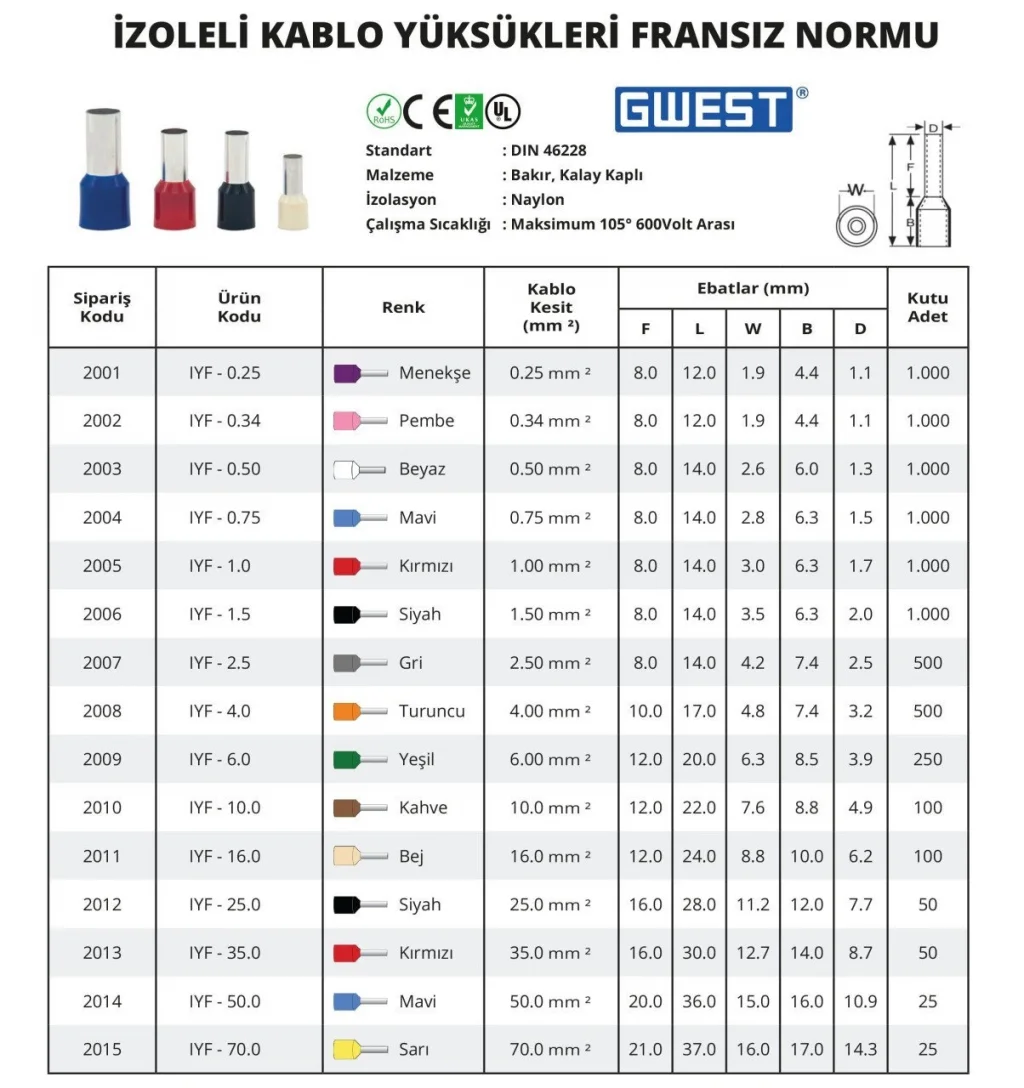 Gwest İzoleli Kablo Yüksükleri Fransız Normu 100 Adet ile güvenli ve uzun ömürlü elektrik bağlantıları sağlayabilirsiniz. Dayanıklı yapısı ve kolay montajı ile her tür elektrikli sistemde güvenliği artırır ve performans sağlar! ⚡?