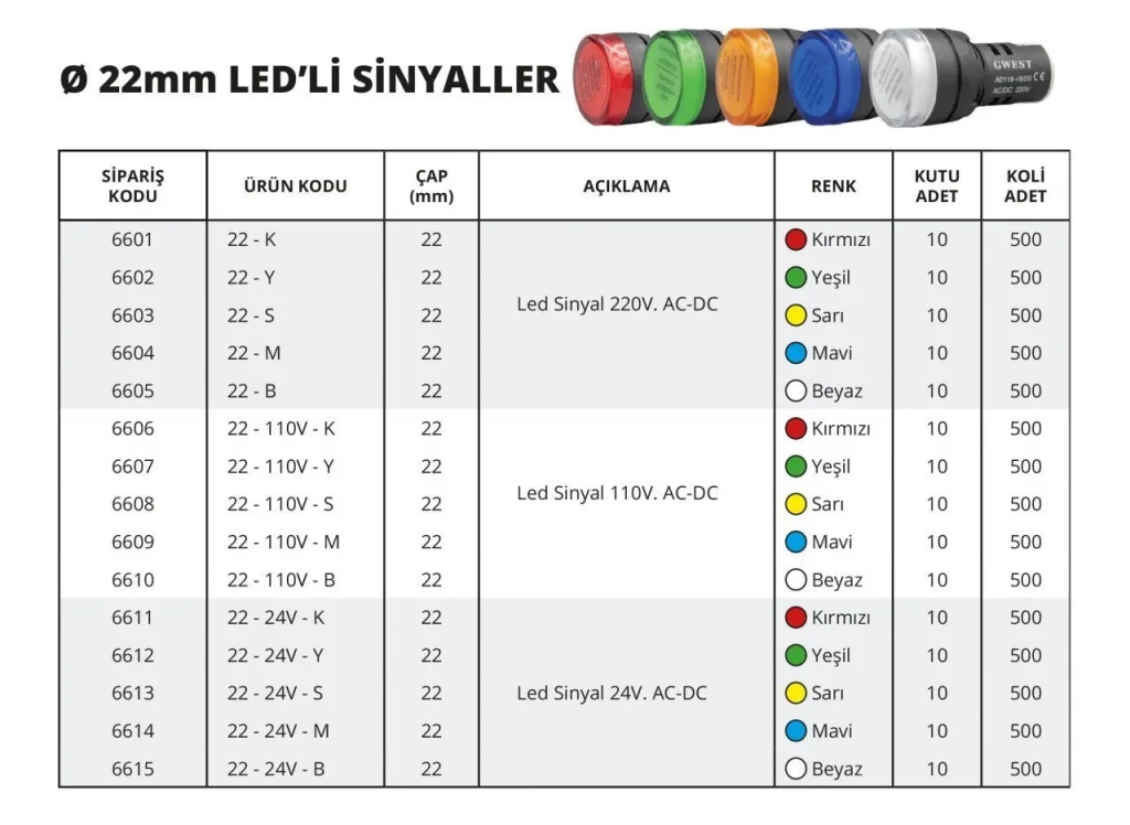 Gwest Ledli Sinyaller, Ø 22 mm standardında, kontrol panolarında görsel alarm, durum bildirimi veya proses yönlendirmesi için tasarlanmış LED göstergelerdir. 10’lu set olarak sunulan bu ürün, hem ekipman takibi hem proje kurulumlarında stok kolaylığı sağlar.