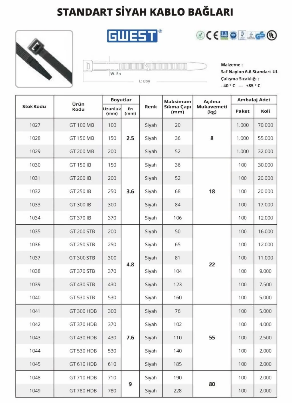 Gwest Siyah Kablo Bağları, farklı uzunluk seçenekleri ile sunulur ve böylece ihtiyacınıza göre kablo bağlarını kolayca ayarlayabilirsiniz. Sert yapısı, kabloların sabitlenmesi için sağlam bir tutuş sağlar ve kabloların dağılmasını engeller. Bu bağlar, özellikle evdeki elektrikli cihazlar, ofislerdeki bilgisayar sistemleri, endüstriyel makineler ve otomotiv elektrik bağlantıları gibi alanlarda yaygın olarak kullanılır.