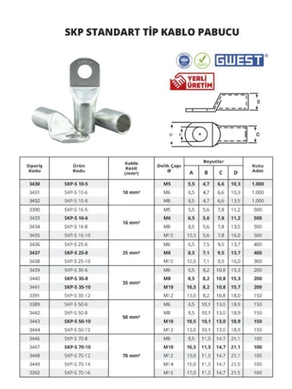 Gwest SKP Standart Tip Kablo Pabucu, kablo uçlarını güvenli ve sağlam bir şekilde bağlamanızı sağlayan kaliteli bir terminal çözümüdür. 150 parçalık set halinde sunulması sayesinde uzun süreli kullanımlarda pratiklik sağlar.