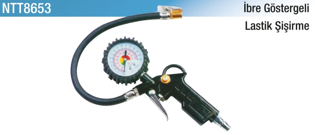 İbre Göstergeli Lastik Şişirme Cihazı, lastik basıncını analog ibre göstergesiyle ölçerek kolay ve pratik şişirme işlemi sunar.