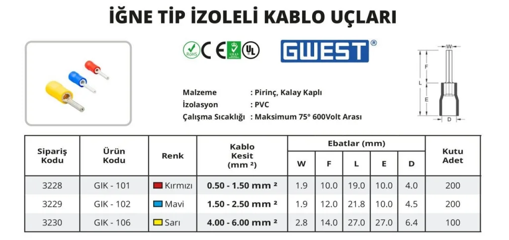 Bu kablo uçları, pano montajları, sanayi tesisatları, otomotiv kablolama sistemleri ve ev elektrik bağlantılarında yaygın olarak kullanılır. İğne tipi tasarımı, klemenslere ve bağlantı noktalarına kolayca yerleştirilmesini sağlar, böylece hızlı ve güvenli montaj imkanı sunar.