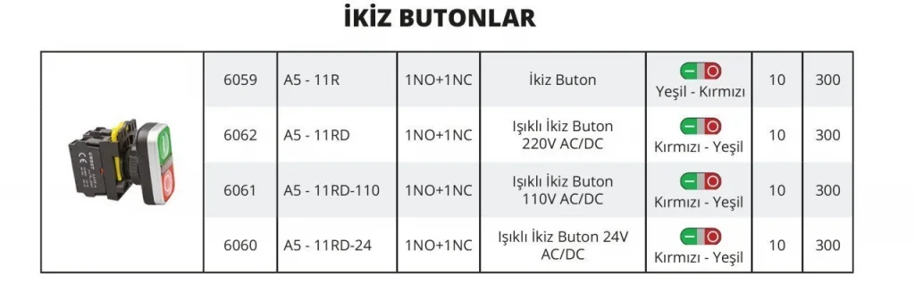 İkiz Buton Modülü, aynı panel içinde iki ayrı kontrol işlevi için tasarlanmıştır. Basıldığında basitçe anlık görevi yerine getirir. Kompakt gövdesi sayesinde dar panolarda bile yerden tasarruf sağlar. 10 adet set, projelerde toplu kullanım avantajı sunar. Montaj kolaylığı, yaylı mekanizma ve dayanıklı yapı sağlar. Makine kontrol sistemlerinde çift betimleme için uygundur.