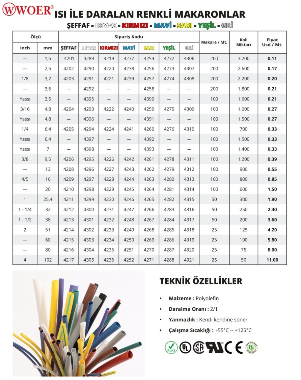 Isı ile daralan renkli makaronlar, elektrik ve elektronik kabloların yalıtımı için ideal çözümdür. Makaronun dış çapı, ısı uygulandığında küçülerek kabloya sıkı ve dayanıklı şekilde oturur. Bu sayede kabloların dış etkenlerden korunması, kısa devre riskinin azaltılması ve bağlantı noktalarının sağlamlaştırılması sağlanır. Renkli yapısı sayesinde kablo gruplarını işaretleme ve tanımlama imkânı verir. UV, kimyasal ve mekanik aşınmalara dayanıklı olması sayesinde uzun ömürlüdür. Endüstriyel tesisatlar, otomotiv, elektronik devre ve ev kablolarında yaygın olarak tercih edilir.