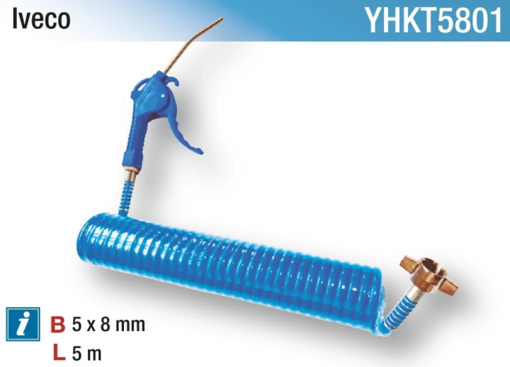 IVECO kamyon ve çekicilerin kabinlerinde biriken toz, kir ve partikülleri hızlıca temizlemek için ideal bir çözümdür. Hortumun 5 metrelik uzunluğu sayesinde aracın tüm iç alanlarına kolaylıkla ulaşım sağlanır. 5x8mm iç ve dış çap ölçüleriyle yaygın temizlik tabancaları ve bağlantı ekipmanları ile uyumludur.