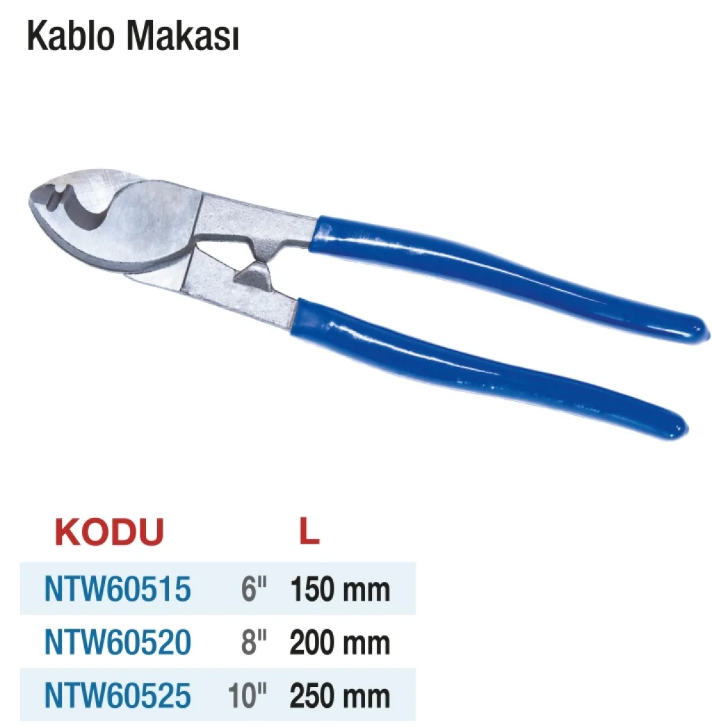 Kablo Makası, elektrik kabloları ve tel kesimleri için özel olarak üretilmiş dayanıklı bir el aletidir. Yüksek karbonlu çelikten imal edilen keskin bıçakları sayesinde kabloları ezmeden, düzgünce keser. Ergonomik sap tasarımı sayesinde el yormaz. Elektrikçiler, teknisyenler ve bakım personelleri için vazgeçilmez bir ekipmandır. Hem sahada hem atölyede rahatlıkla kullanılabilir.