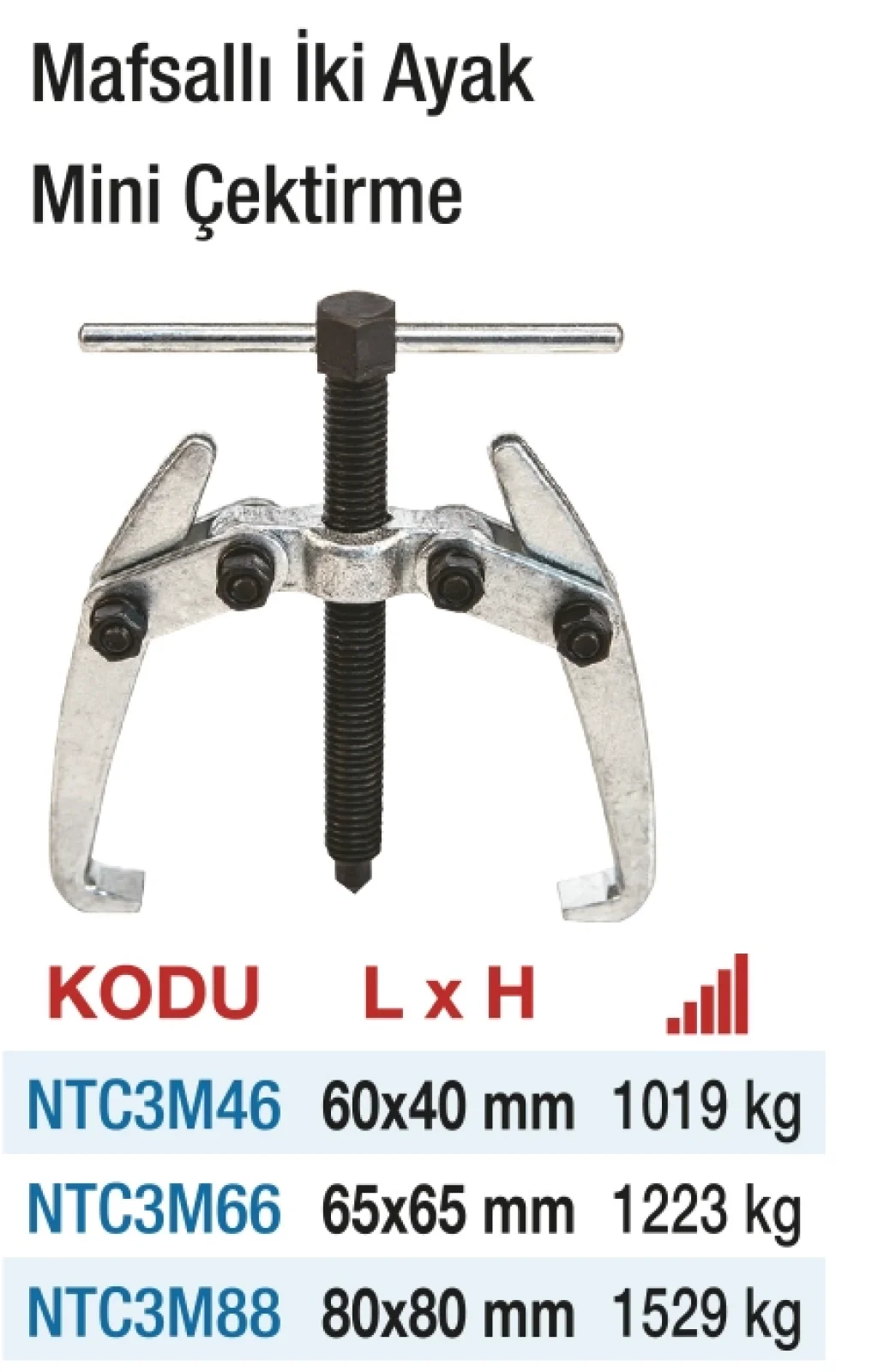 Mafsallı İki Ayak Mini Çektirme, küçük boyutlu rulman, dişli ve kasnakların hassas söküm işlemleri için geliştirilmiş el aparatıdır. Dayanıklı çelik yapısı ve mafsallı ayakları sayesinde kullanım alanını genişletir. Özellikle saatçilik, modelcilik, küçük motor tamiri gibi işlerde idealdir.