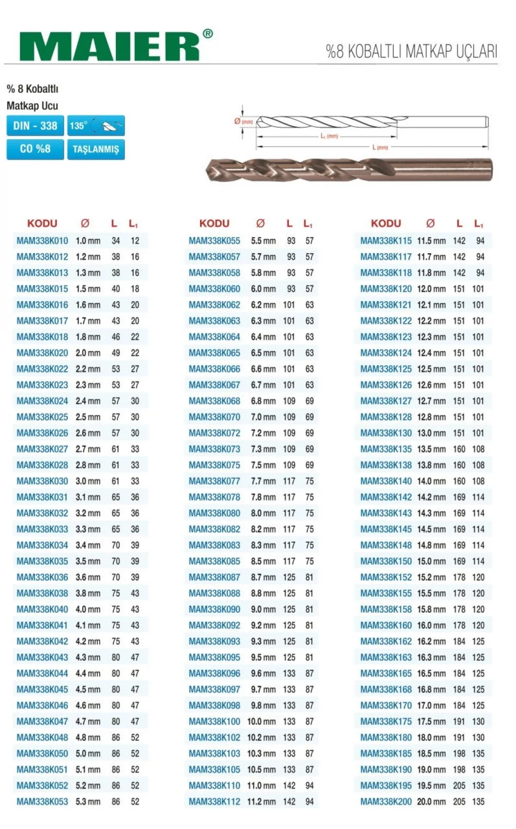 MAIER DIN 338 %8 kobalt içeren silindirik saplı matkap uçları, yüksek kaliteli ve dayanıklı malzemeden üretilmiştir. Bu matkap uçları, uzun ömürlü kullanım sağlar ve çeşitli malzemelerde mükemmel performans gösterir. İşlerinizi hızlı ve kolay bir şekilde tamamlamanıza yardımcı olacak olan bu matkap uçları, profesyonel ve amatör kullanıcılar için ideal bir seçimdir.