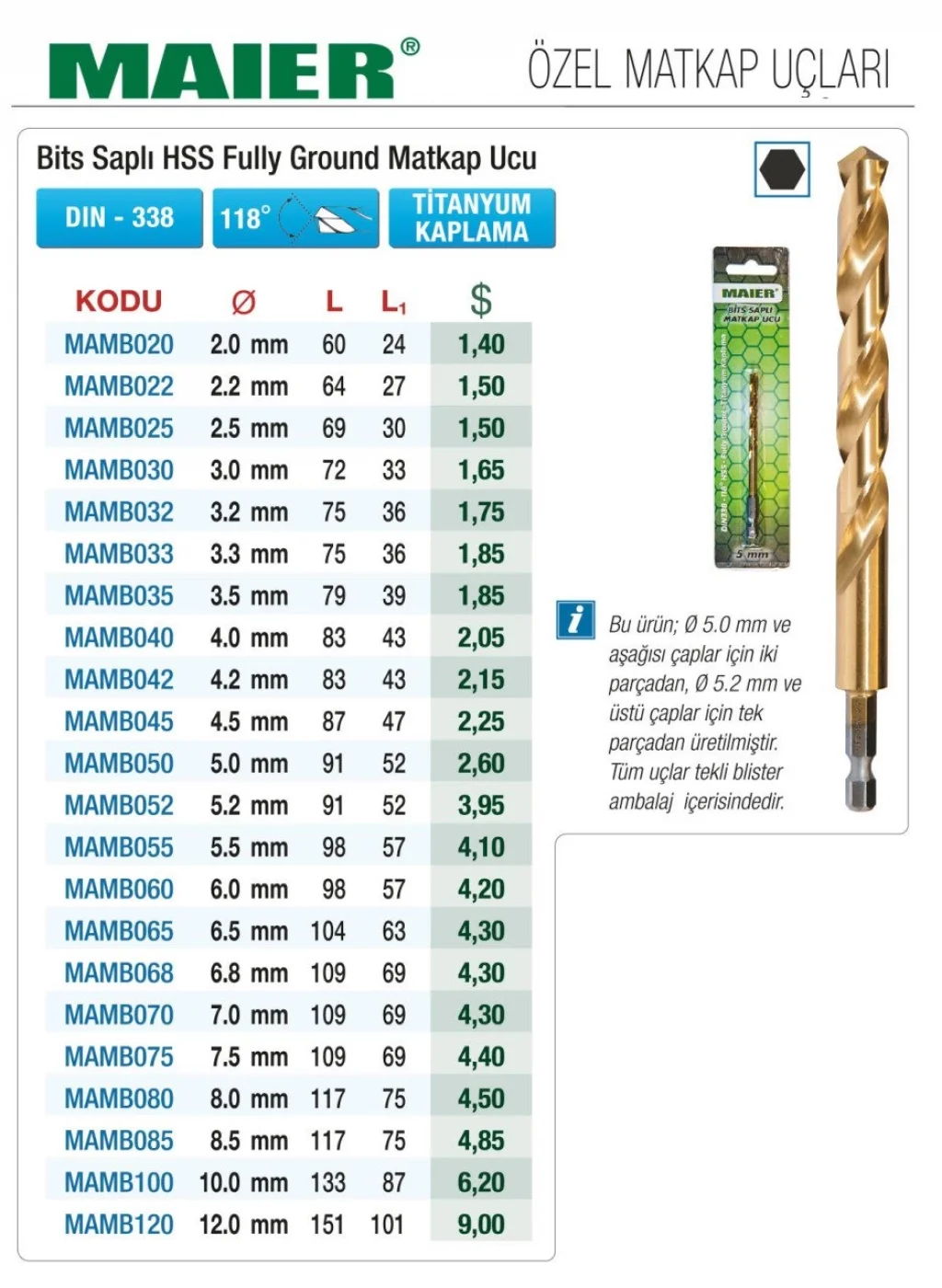 MAIER DIN 338 FULLY GROUND BİTS SAPLI MATKAP UÇLARI, yüksek kaliteli malzemeden üretilmiş dayanıklı matkap uçlarıdır. Kesici uçları tamamen öğütülmüş olup işlevselliği en üst seviyeye çıkarır. Profesyonel kullanım için ideal bir seçimdir.