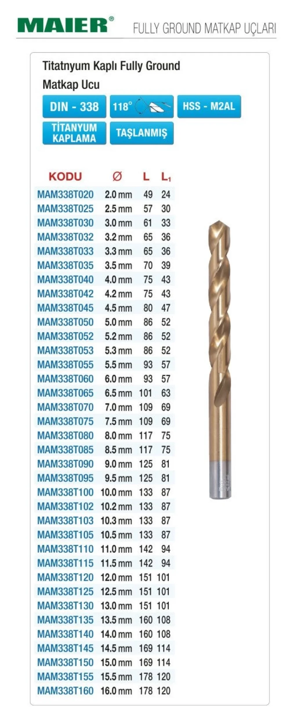 MAIER DIN 338 Titanyum Kaplı Fully Ground Matkap Uçları, yüksek kaliteli malzemeden üretilmiş dayanıklı ve işlevsel matkap uçlarıdır. Titanyum kaplama sayesinde uzun ömürlü kullanım sağlar ve kesme performansını arttırır. Profesyonel ve ev kullanımı için ideal bir seçenektir.