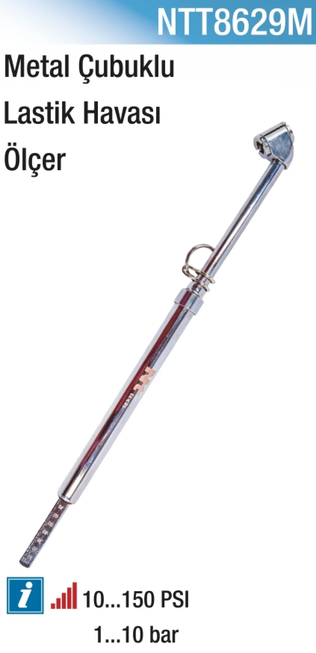 Metal Çubuklu Lastik Havası Ölçer, sağlam metal yapısı sayesinde uzun ömürlü ve dayanıklıdır. Lastik basıncını hassas şekilde ölçerek doğru değerlere ulaşmanızı sağlar.