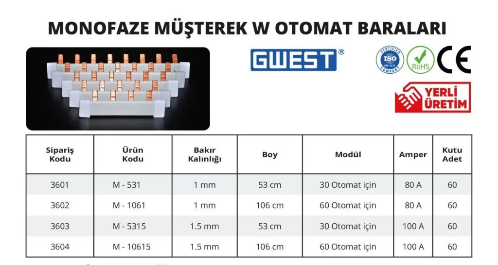 Monofaze Müşterek W Otomat Baraları, tek fazlı elektrik sistemlerinde otomatların hızlı ve düzgün şekilde bağlanması için geliştirilmiştir. 60 adetlik set, büyük projeler ve seri bağlantılar için idealdir. Bakır iletken yapısı, enerji kaybını en aza indirir.