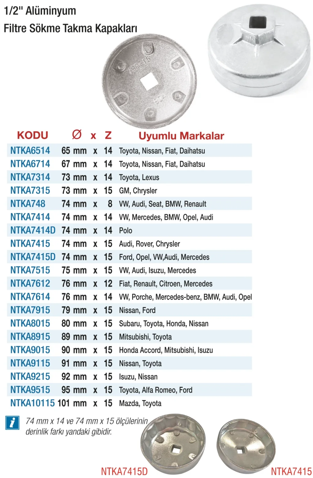 Nttools 1/2'' alüminyum filtre sökme takma kapakları, filtre bakım ve değişim işlemlerini kolaylaştıran hafif ve dayanıklı aksesuarlar olarak tasarlanmıştır. Alüminyum malzemeden üretilen bu kapaklar, paslanmaya karşı dirençlidir ve uzun ömürlü kullanım sağlar. 1/2'' standart ölçüsü ile birçok filtre sistemine uyumludur. Kolay takılıp çıkarılabilen yapısı sayesinde zamandan tasarruf eder ve bakım süreçlerini hızlandırır. Nttools kalitesi ile desteklenen bu ürün, filtre sistemlerinin güvenli ve pratik şekilde sökülüp takılmasını sağlar. Dayanıklı yapısı ve hafifliği, iş güvenliği ve kullanım kolaylığını artırır. Endüstriyel ve otomotiv sektörlerinde yaygın olarak tercih edilen bu kapaklar, filtre bakımında profesyonel çözüm sunar.