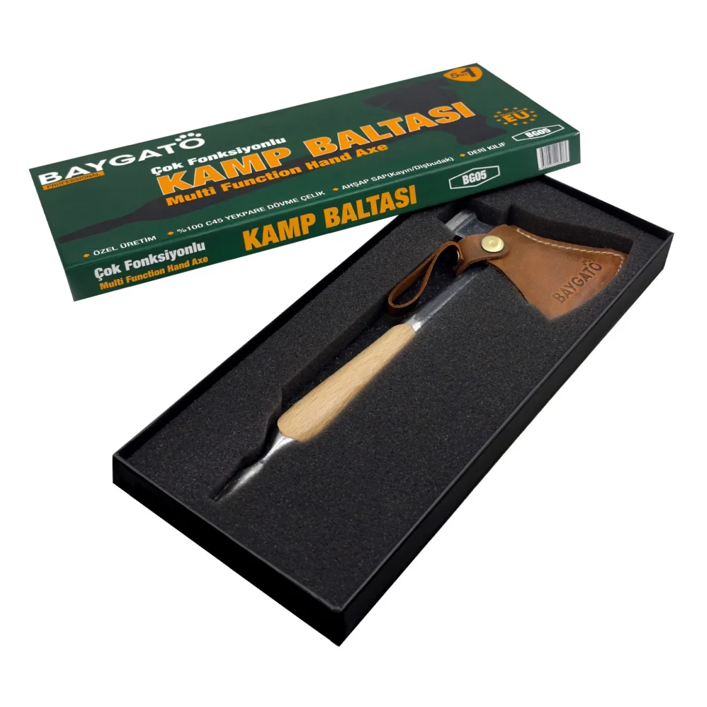 BAYGATO BG05, klasik kamp baltasının çok ötesinde tasarlanmıştır. Sadece odun kesmekle kalmaz, aynı zamanda çeşitli aksesuarları sayesinde çekiç, keski ve tornavida gibi farklı görevleri yerine getirebilir. Bu çok yönlü kullanım, kamp sırt çantanızda fazla ağırlık yapmadan birçok ihtiyacınızı karşılar.