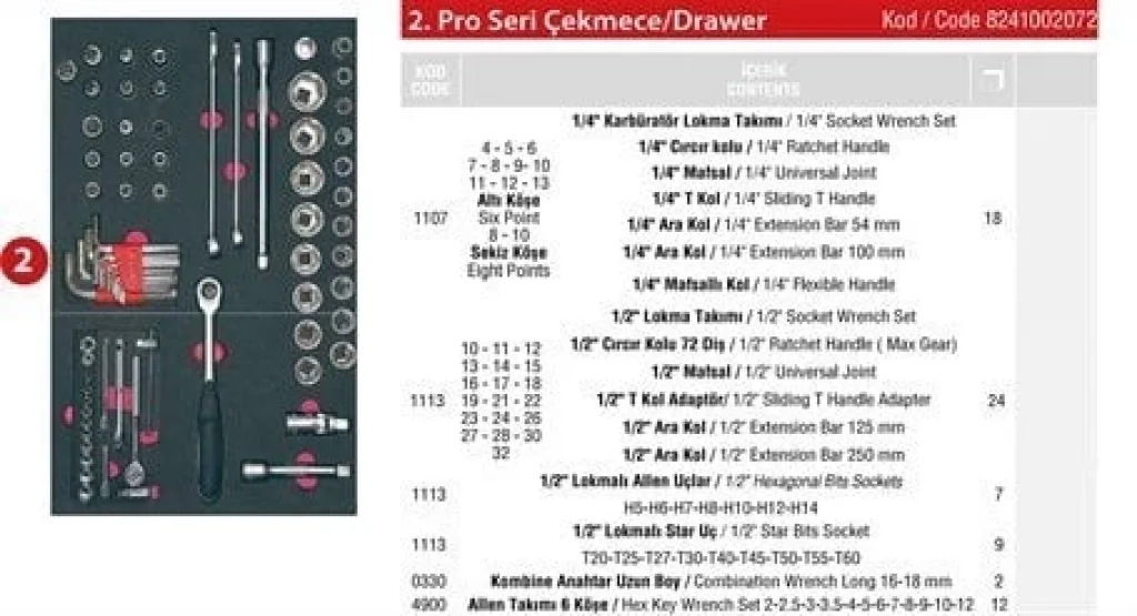 Eğer geniş iç hacme sahip, dayanıklı ve taşınabilir bir çekmece içi el aletleri seti arıyorsanız, Pro Dolap 2. Çekmece İçi 72 Parça tam size göre! Şimdi sipariş verin ve profesyonel çalışma alanınızı düzenleyin!