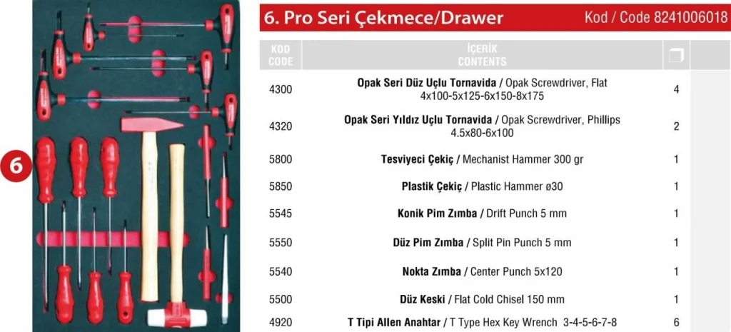 Pro Dolap 6. Çekmece İçi 18 Parça, sanayi, otomotiv servisleri, atölyeler ve tamirhaneler için özel olarak tasarlanmış dayanıklı, pratik ve fonksiyonel bir takım setidir. Geniş içeriği ve düzenli saklama imkânı sayesinde çalışma alanınızı daha verimli hale getirir. İzeltaş el aletleri ve diğer tamir ekipmanlarıyla uyumlu olan bu set, iş süreçlerinizi hızlandırarak profesyonel bir kullanım sağlar.